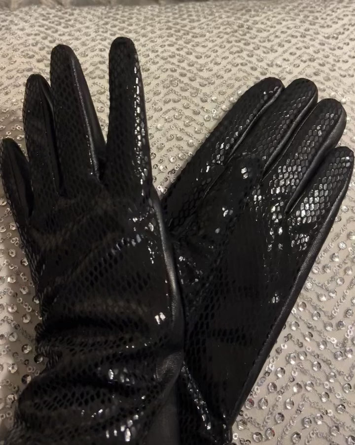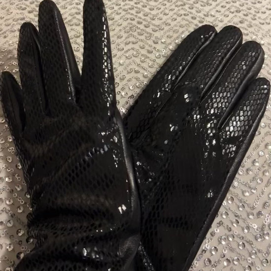 These gloves from the Candice Milan collection are so pretty! Well...actually...pretty is an understatement. Black shiny snakeskin leather is set against supple black deerskin leather. Look at the pics and video these gloves are gorgeous and will step your winter wardrobe ALL they wayyy up!